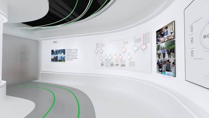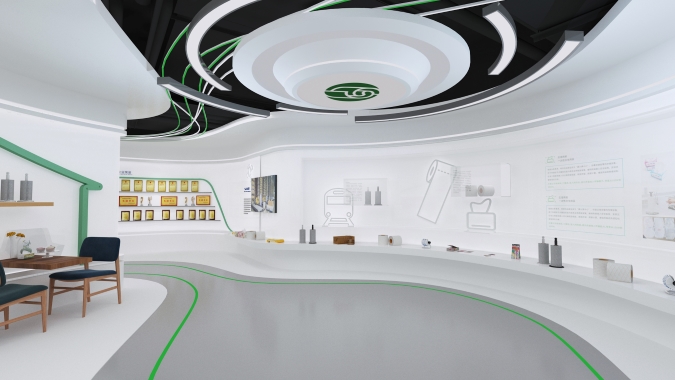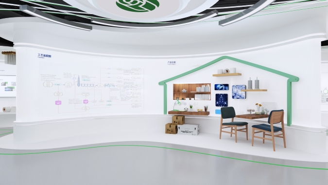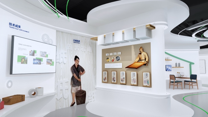 中国制浆造纸研究院展厅(北京)大约120平米。空间中我们以纸张、书脊为设计灵感,强化展室的行业属性,巧妙的与空间相融合,传递可持续发展的绿色理念。