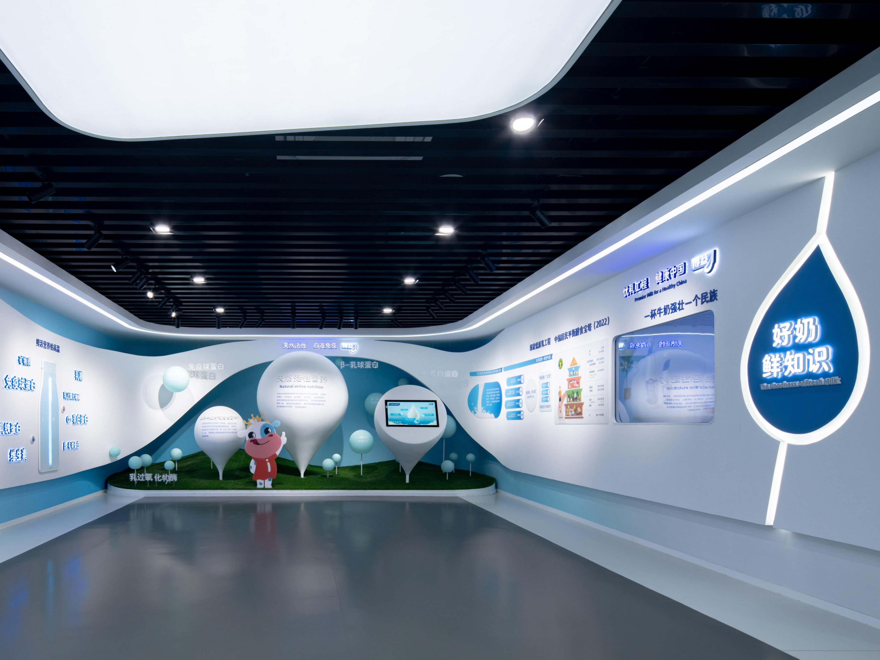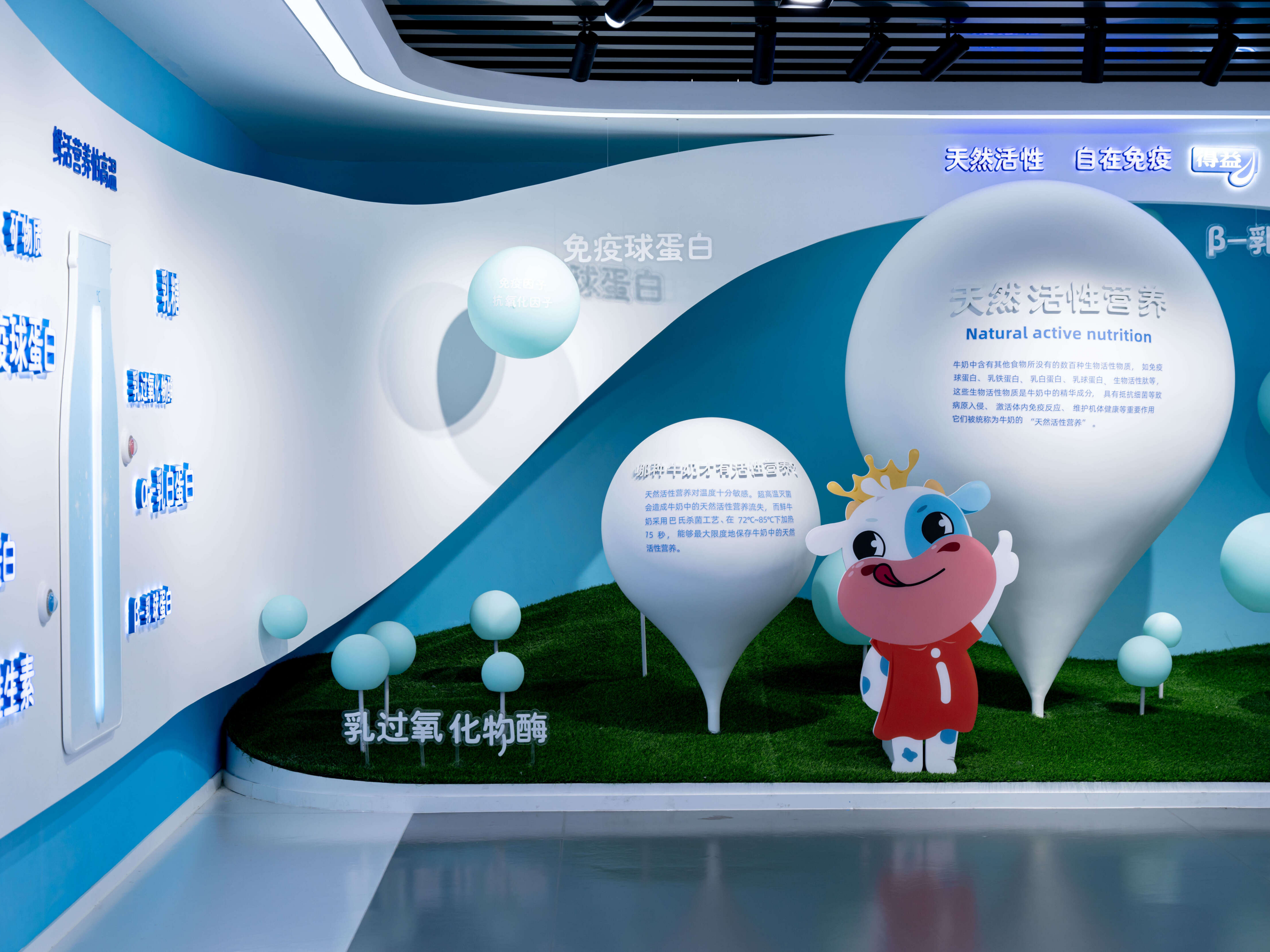 1500平米的展厅中,围绕得益低温奶的核心竞争力——“鲜活”进行体验设计。观众化身巴氏奶探鲜官,展开沉浸式探索一杯好奶科技秘密的鲜活之旅。
